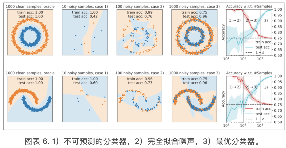 图表 6. 1)不可预测的分类器,2)完全拟合噪声,3)最优分类器。