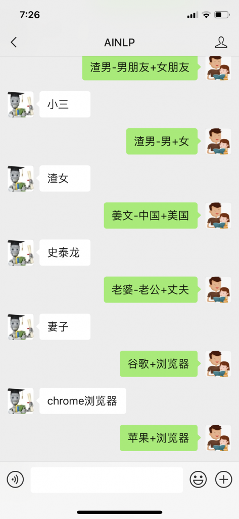特别是最后一篇文章,在这篇文章发布后,很多同学通过AINLP的公众号后台对话玩得很嗨,并且在微博、微信平台留言,这里基于大家的群体智慧,提供一些有意思的词(类比)加减例子,这些例子可以直接在AINLP公众号后台测试: