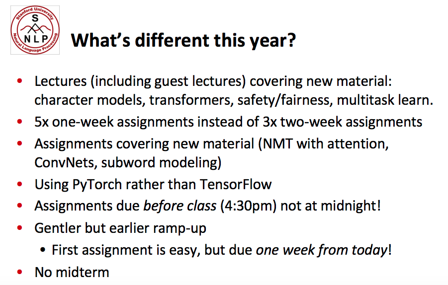 这门自然语言处理课程是值得每个NLPer学习的NLP课程,由 Christopher Manning 大神坐镇主讲,面向斯坦福大学的学生,在斯坦福大学已经讲授很多年。此次2019年新课,有很多更新,除了增加一些新内容外,最大的一点大概是代码由Tensorflow迁移到PyTorch: