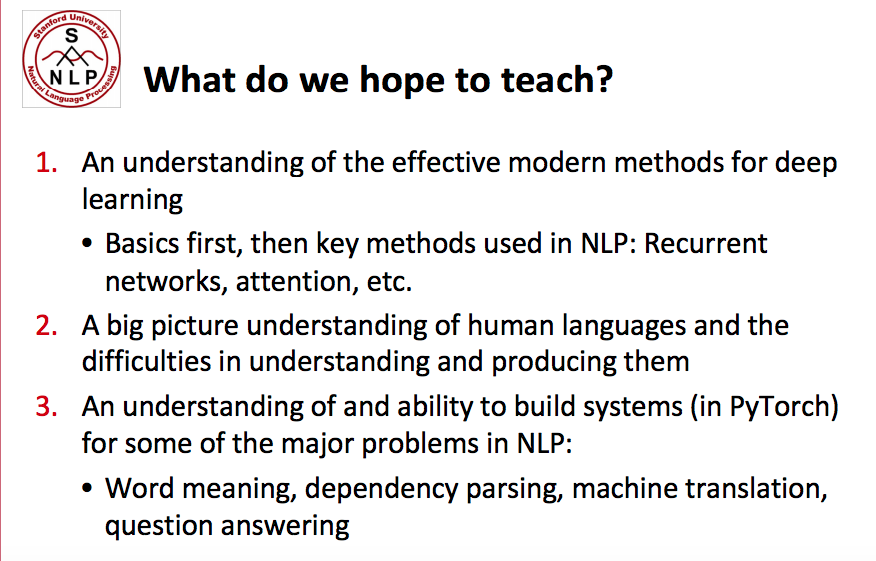 这几年,由于深度学习、人工智能的概念的普及和推广,NLP作为AI领域的一颗明珠也逐渐广为人知,很多同学由此进入这个领域或者转行进入这个领域。Manning大神在第一堂课的视频开头之处给学生找位子(大概还有很多同学站着),同时开玩笑的说他在斯坦福大学讲授自然语言处理课程的第一个十年,平均每次选课的学生大约只有45个。