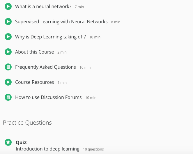 第一周关于“深度学习的介绍”非常简单,也没有编程作业,只有简单的选择题练习,主要是关于深度学习的宏观介绍和课程的相关介绍: