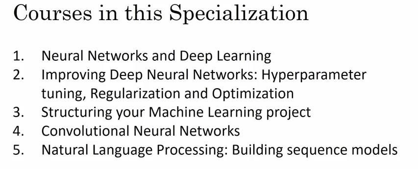 In five courses, you will learn the foundations of Deep Learning, understand how to build neural networks, and learn how to lead successful machine learning projects. You will learn about Convolutional networks, RNNs, LSTM, Adam, Dropout, BatchNorm, Xavier/He initialization, and more. You will work on case studies from healthcare, autonomous driving, sign language reading, music generation, and natural language processing. You will master not only the theory, but also see how it is applied in industry. You will practice all these ideas in Python and in TensorFlow, which we will teach.