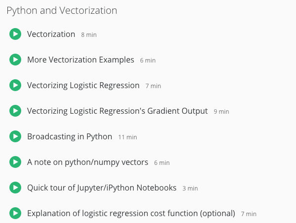 第二周课程同时也提供了编程作业所需要的基础部分视频课程:Python and Vectorization。这门课程的编程作业使用Python语言,并且提供线上 Jupyter Notebook 编程环境完成作业,无需线下编程验证提交,非常方便。这也和之前机器学习课程的编程作业有了很大区别,之前那门课程使用Octave语言(类似Matlab的GNU Octave),并且是线下编程测试后提交给服务器验证。这次课程线上完成编程作业的感觉是非常棒的,这个稍后再说。另外就是强调数据处理时的 Vectorization(向量化/矢量化),并且重度使用 Numpy 工具包, 如果没有特别提示,请尽量避免使用 "for loop":