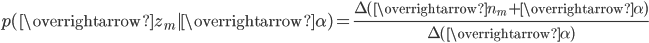 p(\overrightarrow{\mathbf{z}} |\overrightarrow{\alpha}) & = \prod_{m=1}^M p(\overrightarrow{z}_m |\overrightarrow{\alpha}) \notag \\