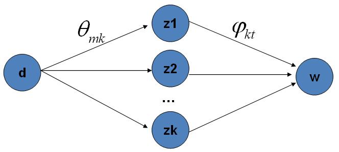这个公式是很漂亮的, 右边其实就是 $p(topic|doc) \cdot p(word|topic)$,这个概率其实是 $doc \rightarrow topic \rightarrow word$ 的路径概率,由于topic 有$K$ 个,所以 Gibbs Sampling 公式的物理意义其实就是在这$K$ 条路径中进行采样。