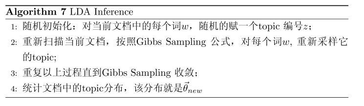有了 LDA 的模型,对于新来的文档 $doc_{new}$, 我们如何做该文档的 topic 语义分布的计算呢?基本上 inference 的过程和 training 的过程完全类似。对于新的文档, 我们只要认为 Gibbs Sampling 公式中的 $\hat{\varphi}_{kt}$ 部分是稳定不变的,是由训练语料得到的模型提供的,所以采样过程中我们只要估计该文档的 topic 分布$\overrightarrow{\theta}_{new}$就好了。